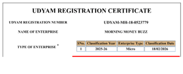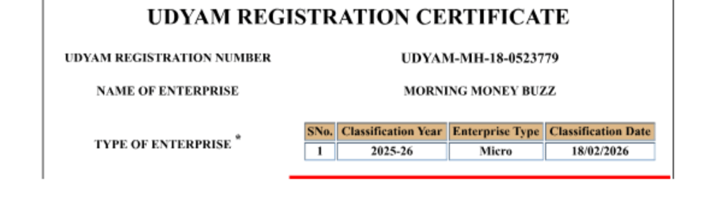 Morning Money Buzz is a registered Micro Enterprise under India’s Ministry of Micro, Small and Medium Enterprises (MSME). This certification, issued under the Udyam Registration System, recognises our business as a legitimate provider of digital products.