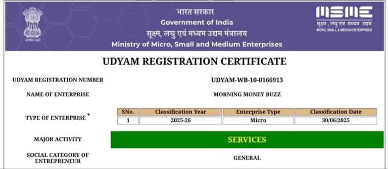 Morning Money Buzz is a registered Micro Enterprise under India’s Ministry of Micro, Small and Medium Enterprises (MSME). This certification, issued under the Udyam Registration System, recognises our business as a legitimate provider of digital products.